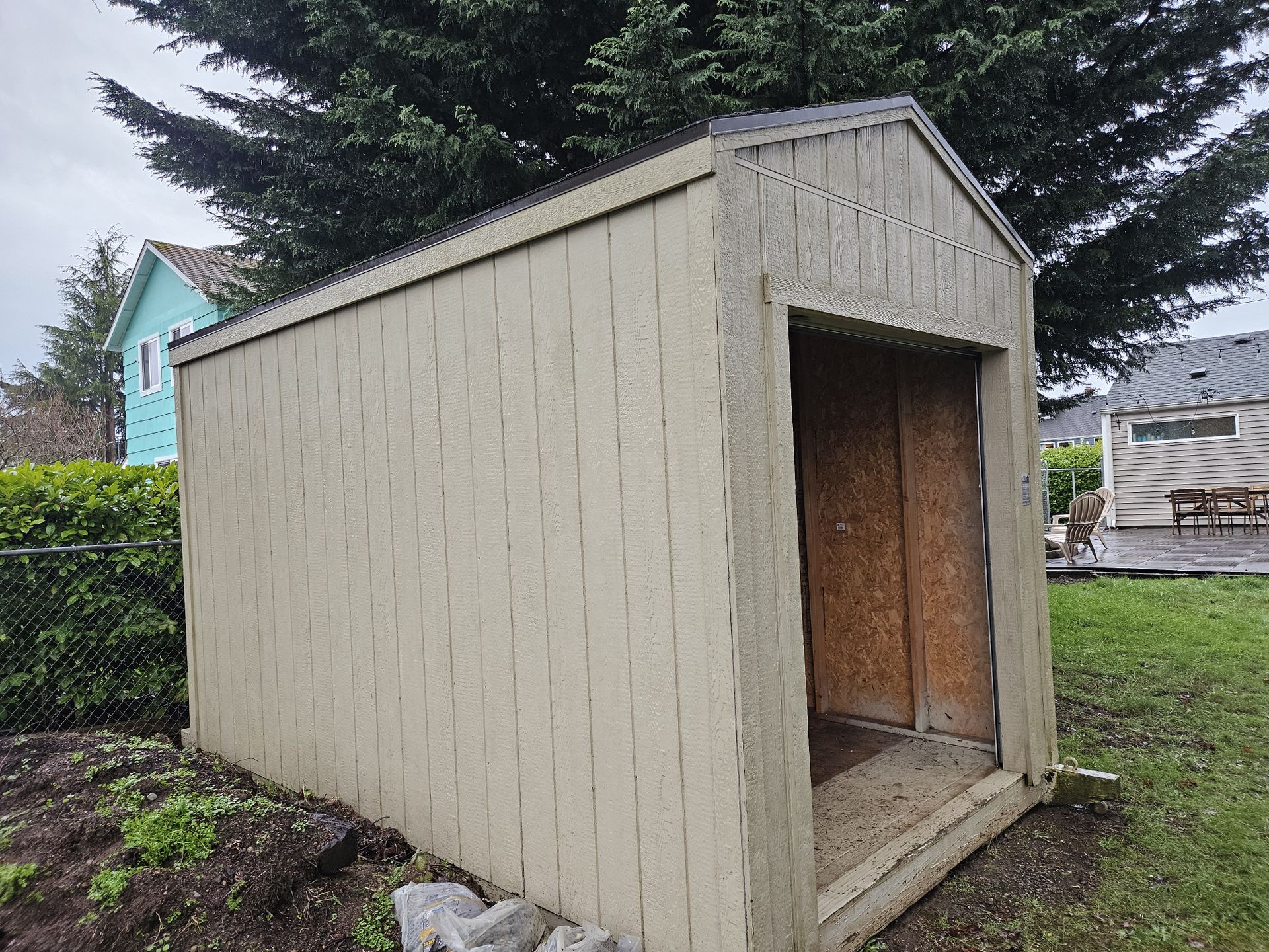 14ft x 8ft wooden shed built by RentMe Storage. The shed has a lofted 4ft × 8ft area in the back to increase storage space. This is a very well built, sturdy, and reliable structure with a shingled roof, metal roll-up door on the front. It is in great condition! We are selling it because our property has two of these sheds and we only need one, but we love them. 2800 OBO
