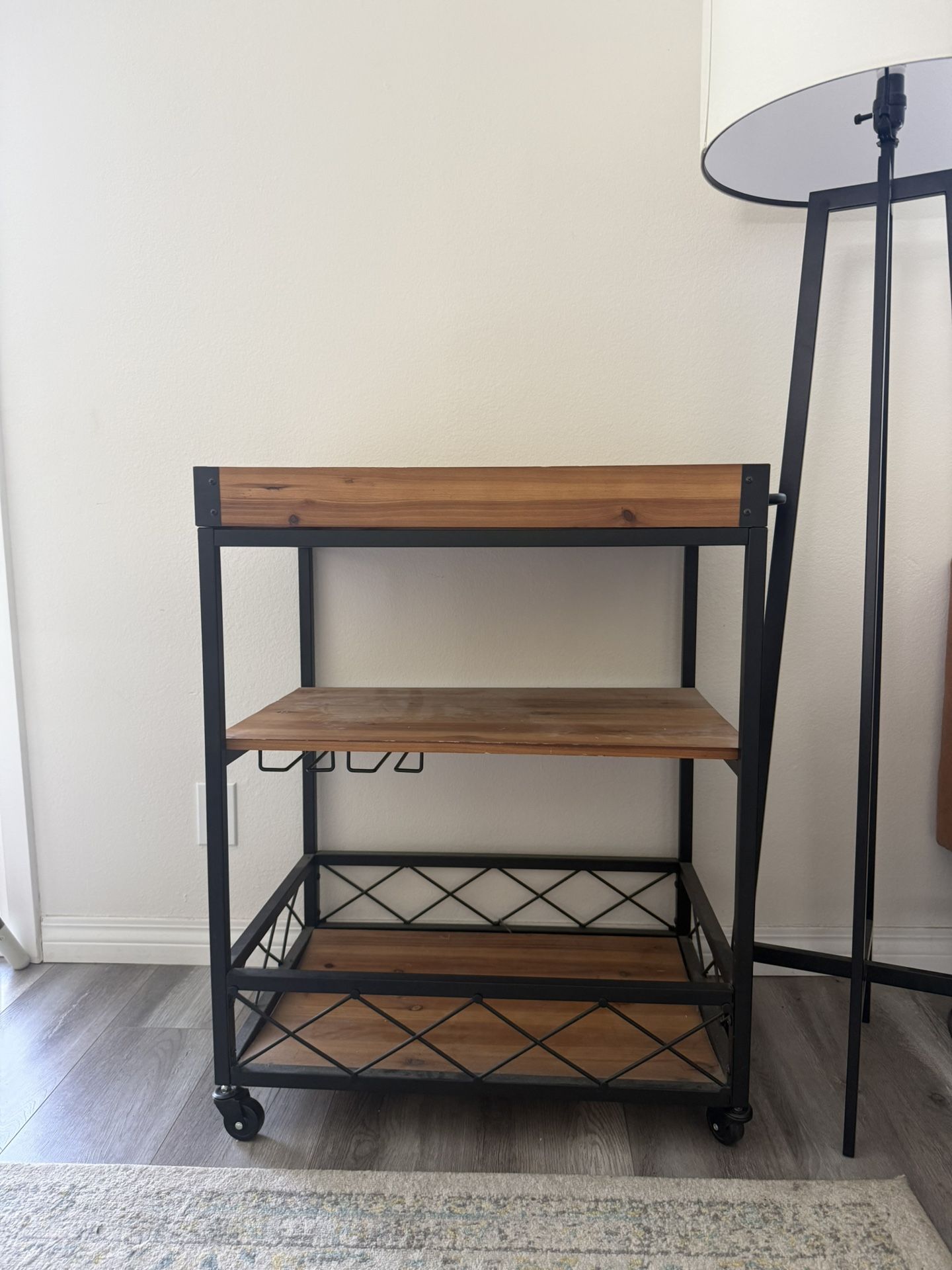 Bar cart that we have had for five years. No longer need. Please note that the bottom shelf is slightly bowed. 26” wide 18” deep 34” high