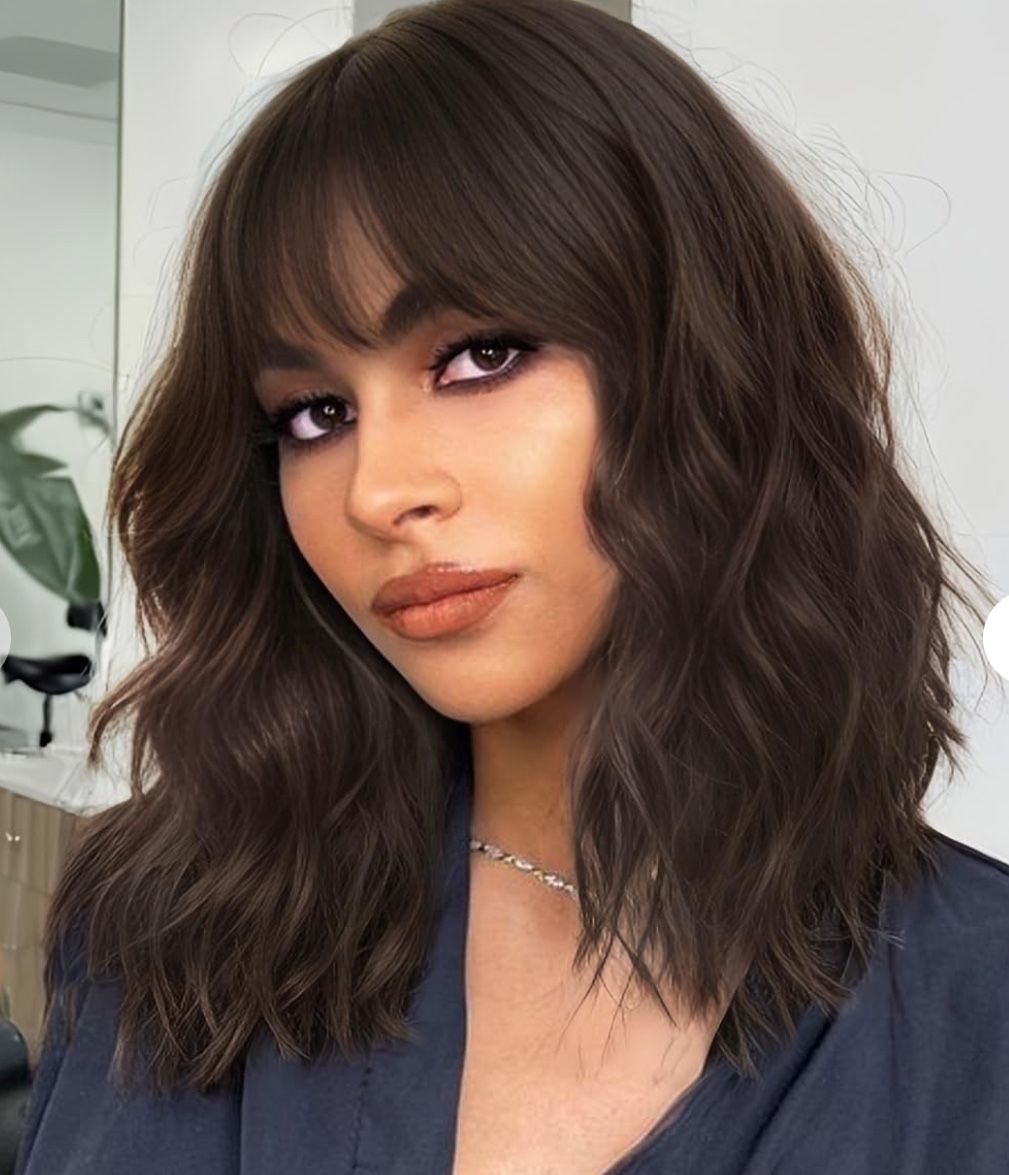 AISI HAIR Natural Brown Synthetic Curly Wavy Bob Wig With Bangs For Women, 21-23 Inches