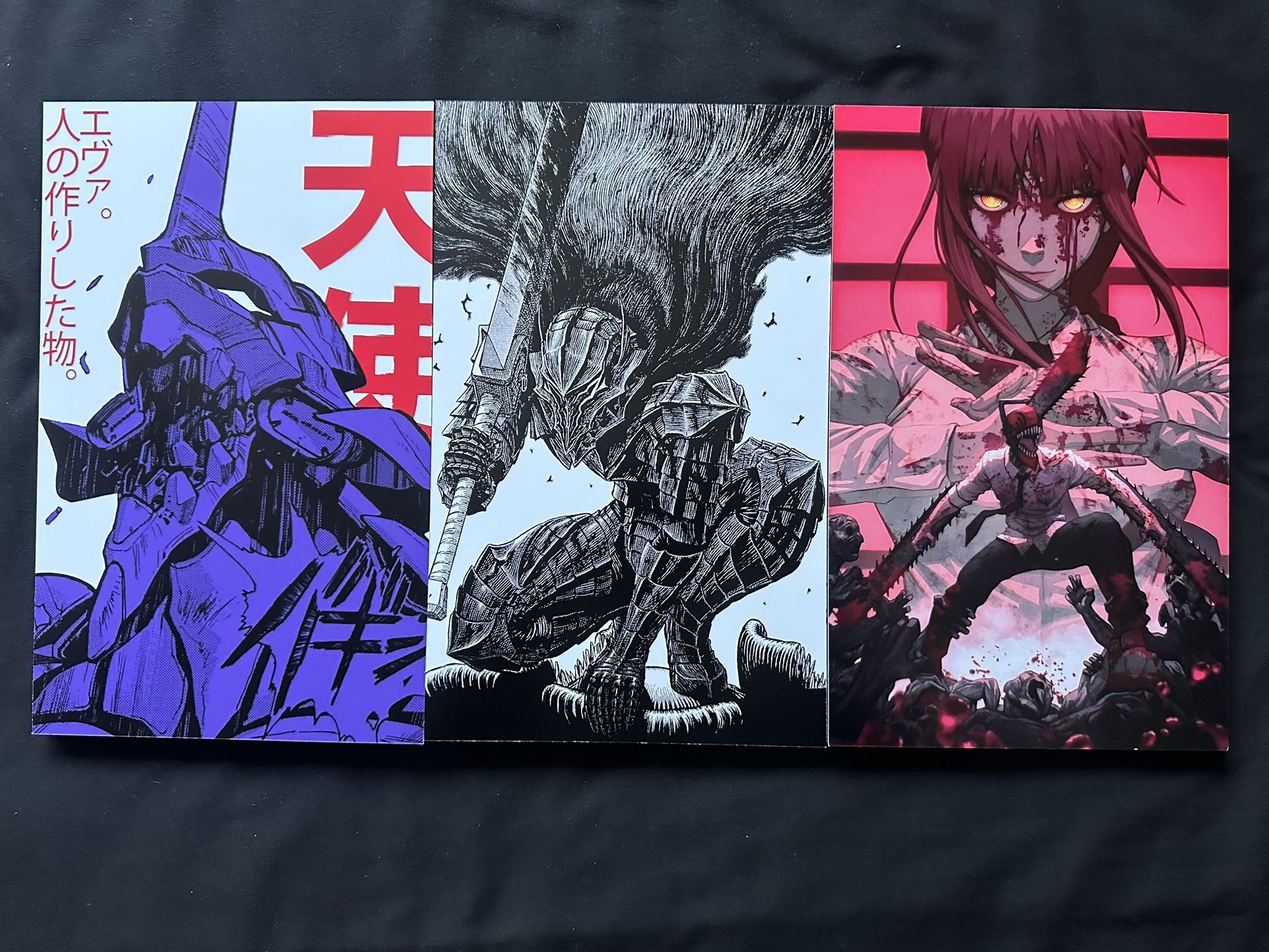 Three anime foam posters of Evangelion, Berserk, and Chainsaw Man $10 Each $25 for all 3