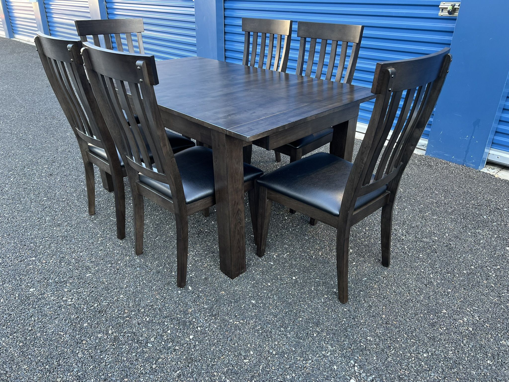 7 piece dining set. It is a solid wood table with 6 heavy duty chairs. It was only used for 30 days and is in excellent condition. The table comes with two 18 inch leaf extensions that are stored under the table. I can deliver and set up for free. It is a real solid wood set. It is heavy and easy to disassemble. Table is 63.5 inches long, 38 inches wide and 30 inches tall. Seat height is 18 inches and the back height is 40 inches tall. Each leaf is 18 inches. With both leafs in it the table 99.5 inches long. This set retails for $2,999 plus tax. I am only asking $1,250 total.
