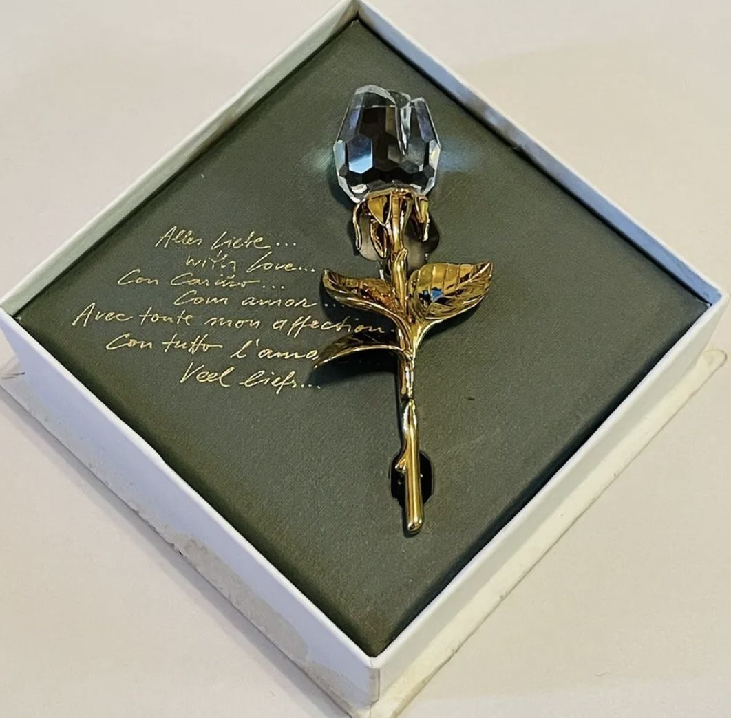 RARE 3” Swarovski Crystal ROSE PIN BROOCH Gold Plated Item is pre-owned. Brooch is intact with no scratches, scuffs or chips. Have bottom of the box but no top and no pamphlet. Sold as is