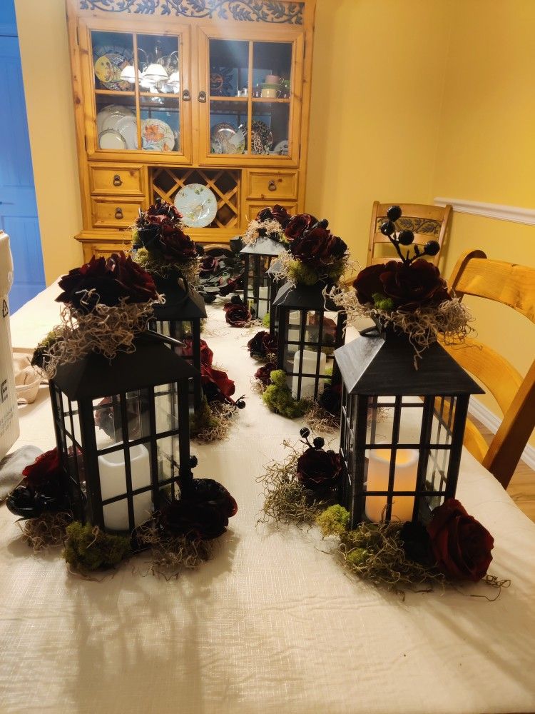 8 lantern centerpieces 2 rose vines 1 unopened roll of red ribbon 50 plastic red charger plates Plastic dessert plates Paper 15 stop What part of no didn't you get the first time