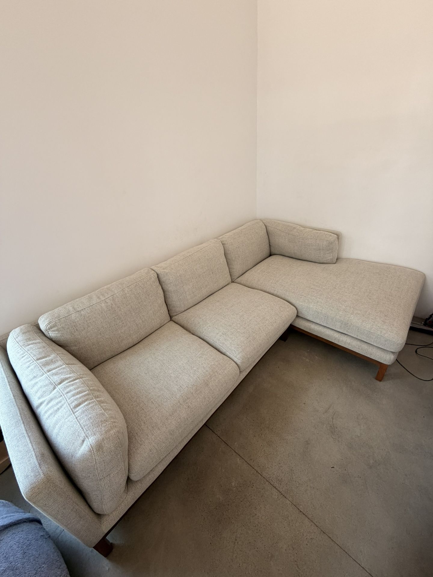 Owen Chaise Sectional Sofa, Walnut Right Facing - Walnut Stain - Pearl Beige Bought 2/2023 for $2,700, less than 3 years old. Just cleaned and vacuumed. Extremely comfortable, can fit 4 people easily. We love this couch but are moving to a new place where it doesn’t fit. No stains, rips, or tears. In excellent condition. Pickup only. $1,200 OBO.