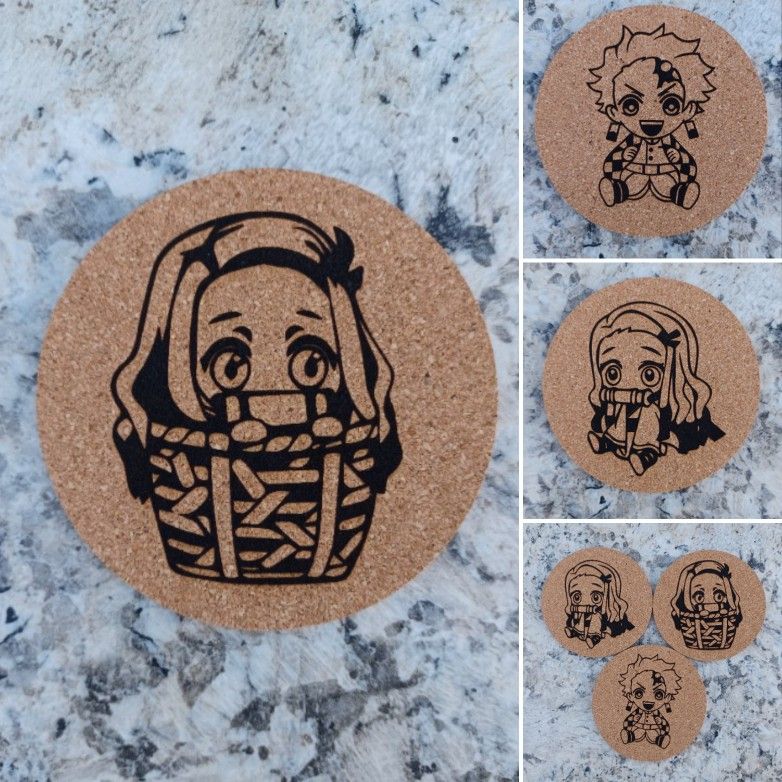 Cute Nezuko and Tanjiro cork coasters! 5 mm thick custom engraved cork coasters. Other characters from Demon Slayer available! Mix and match with other fandoms too! Add names and other characters/logos you would like to see! Perfect small personalizable gift for all occasions. Housewarming, birthdays, holidays and more! Msg me for details!