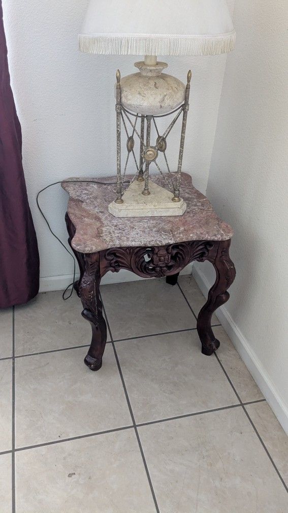 Beautiful marble table and a marble antique lamp, just don't make them like this anymore, selling together $50 or $25 each. The tiger is sold.
