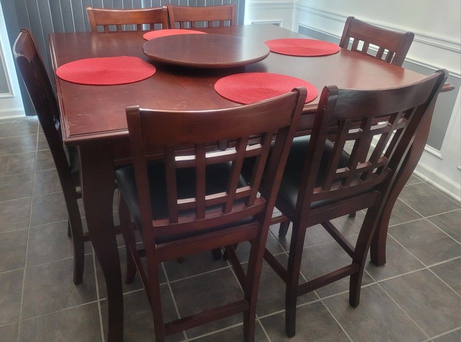 Used Counter Height Dining Set comes with table, 6 chairs, and a round spinning dining serving tray. Table has some dings. See picture for discoloration in table top. Other than that the table is sturdy. All chairs leather is in good shape, only minor dings on chairs wood. Pick up only location Decatur GA
