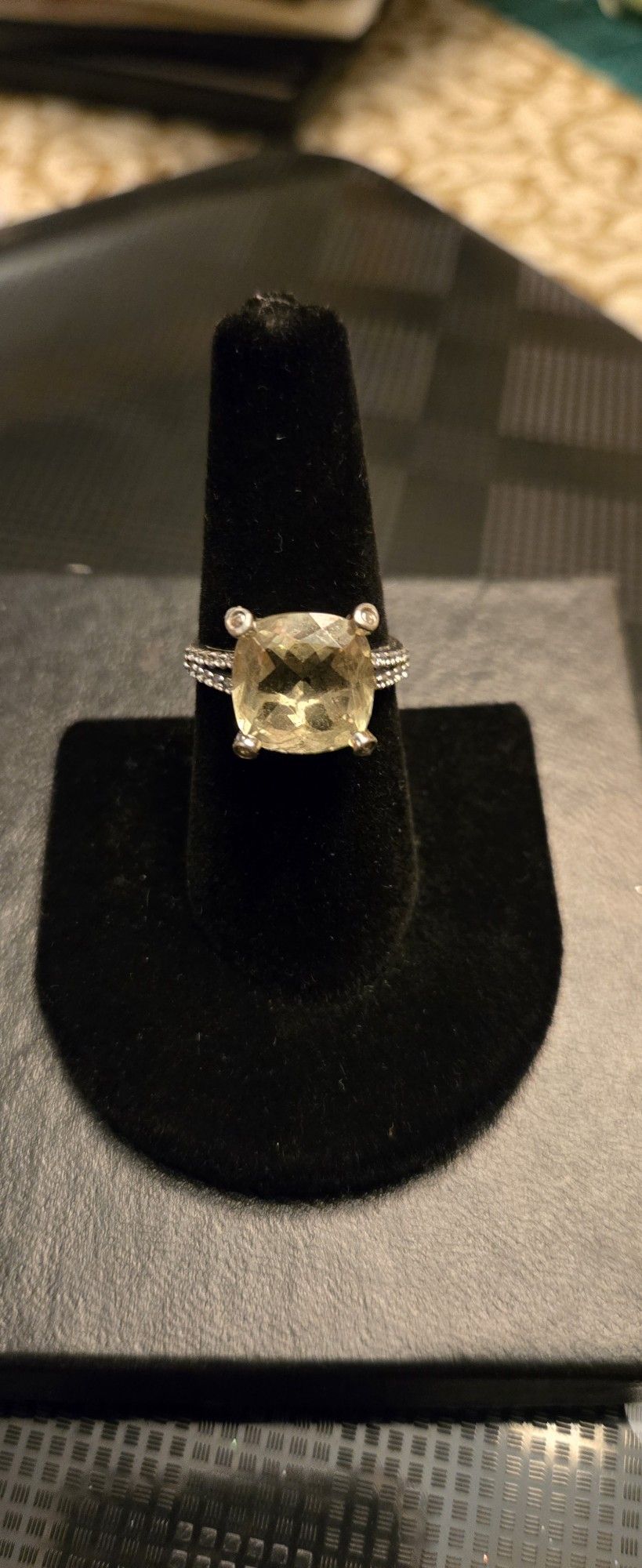 Yellow quartz ring, square shape 1/2 in. Faced in checkerboard style, and Zirconia stones on sides, sterling silver, sz- 7.5in.