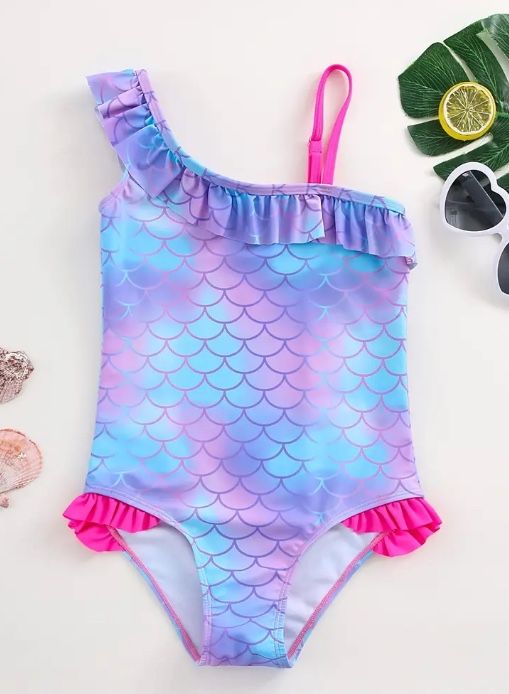 Girl's Onesie Swimsuit, Mermaid Fish Scale Print Ruffle Decor Camisole Bathing Suit, Kids Clothes For Summer Beach Vacation