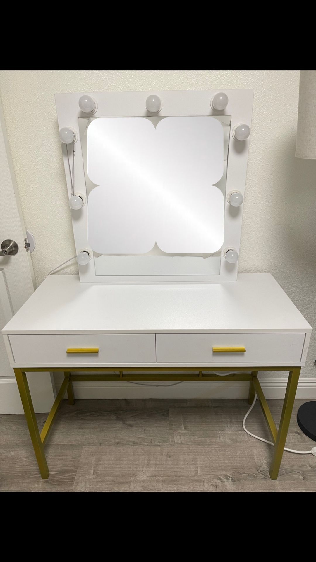 Vanity with gold accents, spacious, bulbs light hp brightly, works perfectly, can go lower on price
