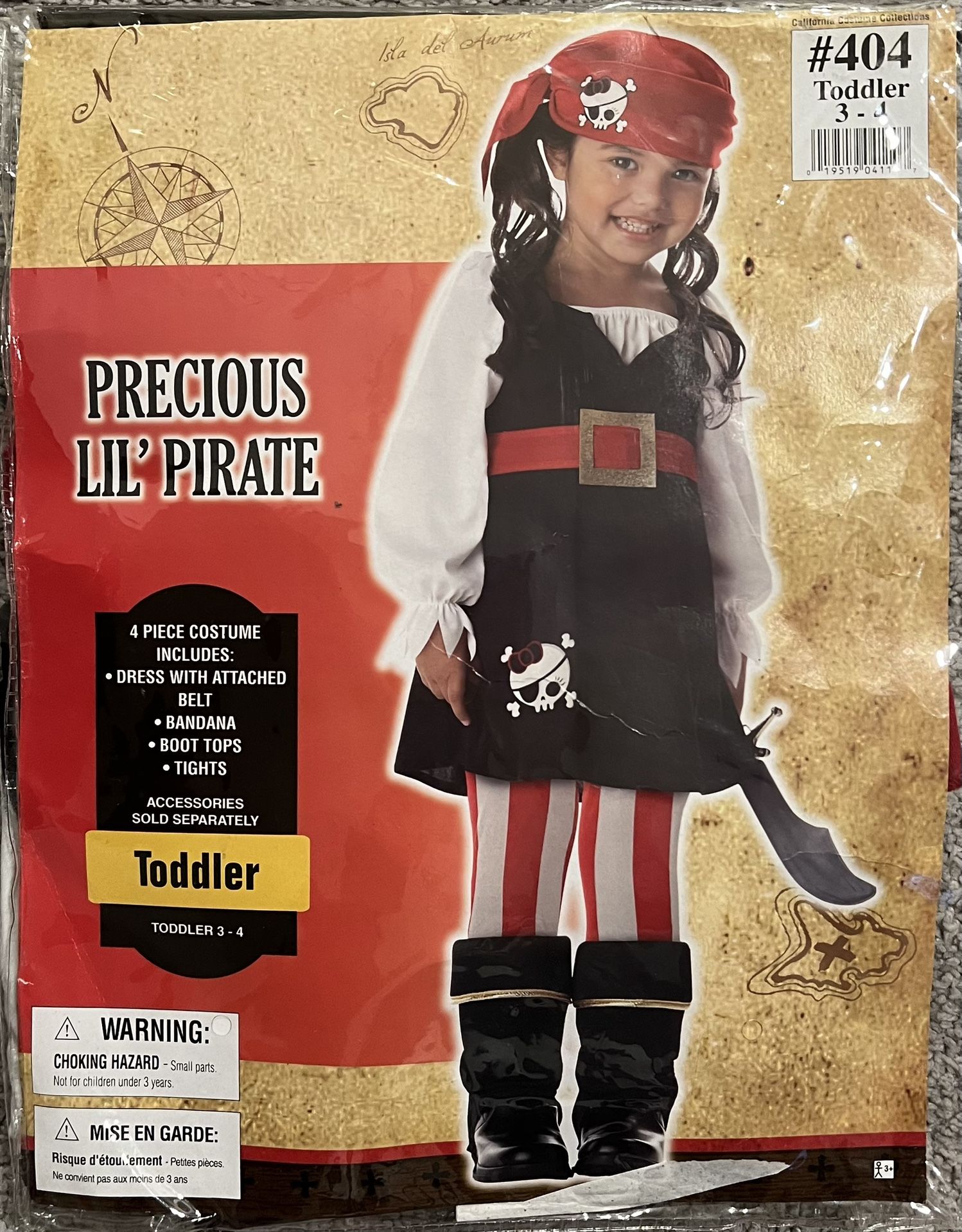 Pirate costume 4 pieces costumes. Includes: - Dress with attached belt - Bandana - Boot tops - Tights Size: toddler 3-4