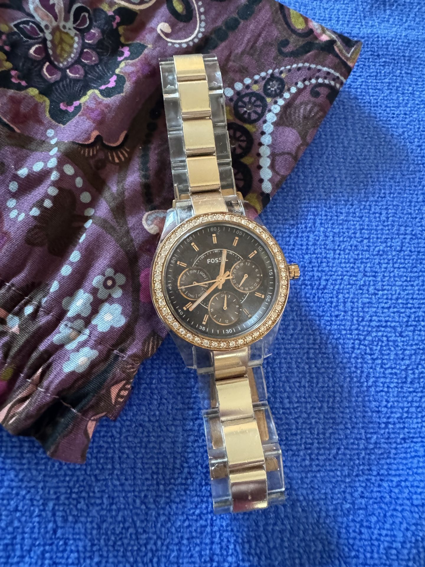 FOSSIL Rose Gold/Clear Band Black Face Glass has no scratches or cracks Needs new battery Pick up 92883 Before you message me, please know that I am South Corona - almost to Lake Elsinore off 15fwy I’m in Horsethief Canyon off Indian Truck Trail Cash only