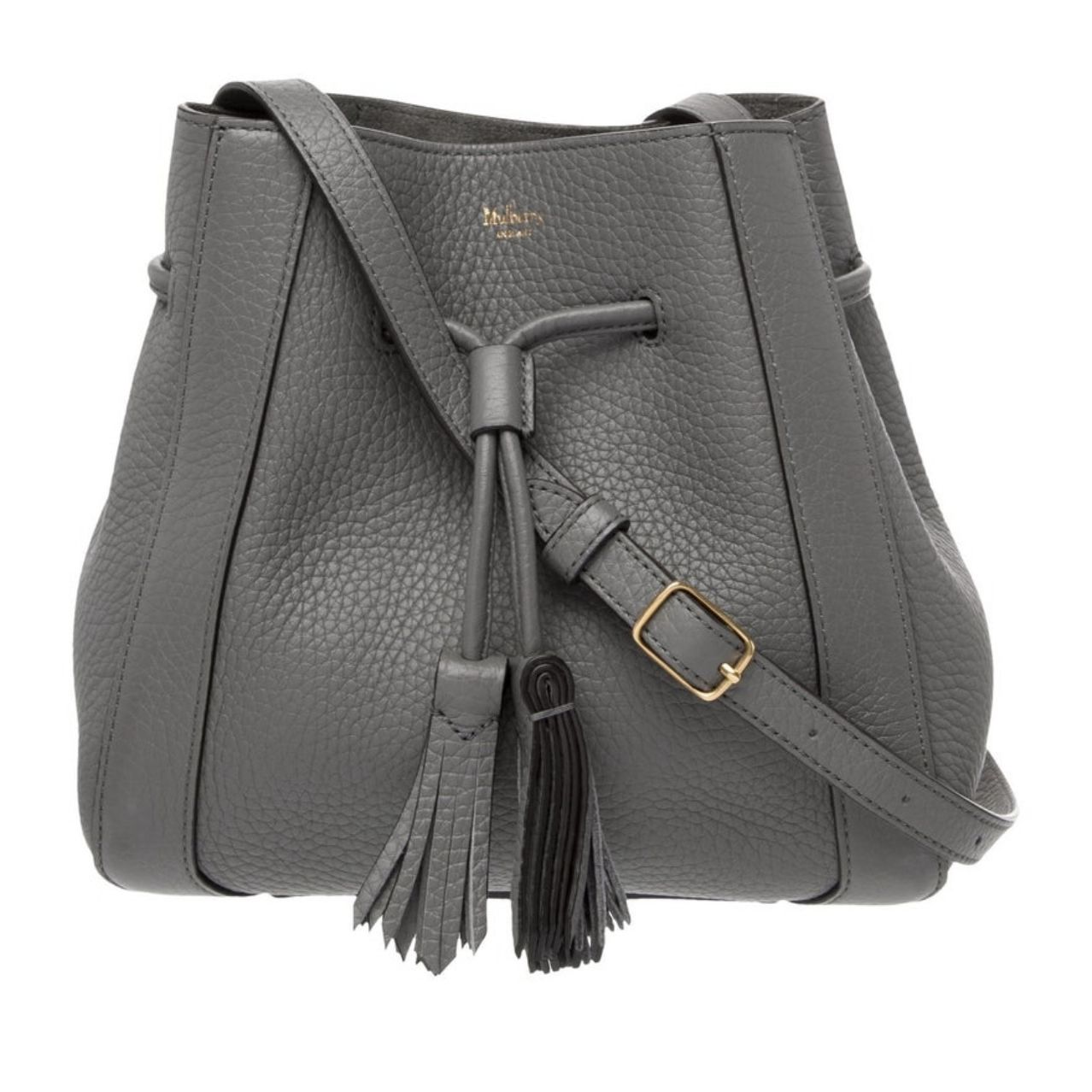 Mulberry Bucket Bag Grey Leather Gold-Tone Hardware Flat Handles & Single Adjustable Shoulder Strap Fringe & Tassel Accents Suede Lining Drawstring Closure at Front It’s in excellent condition