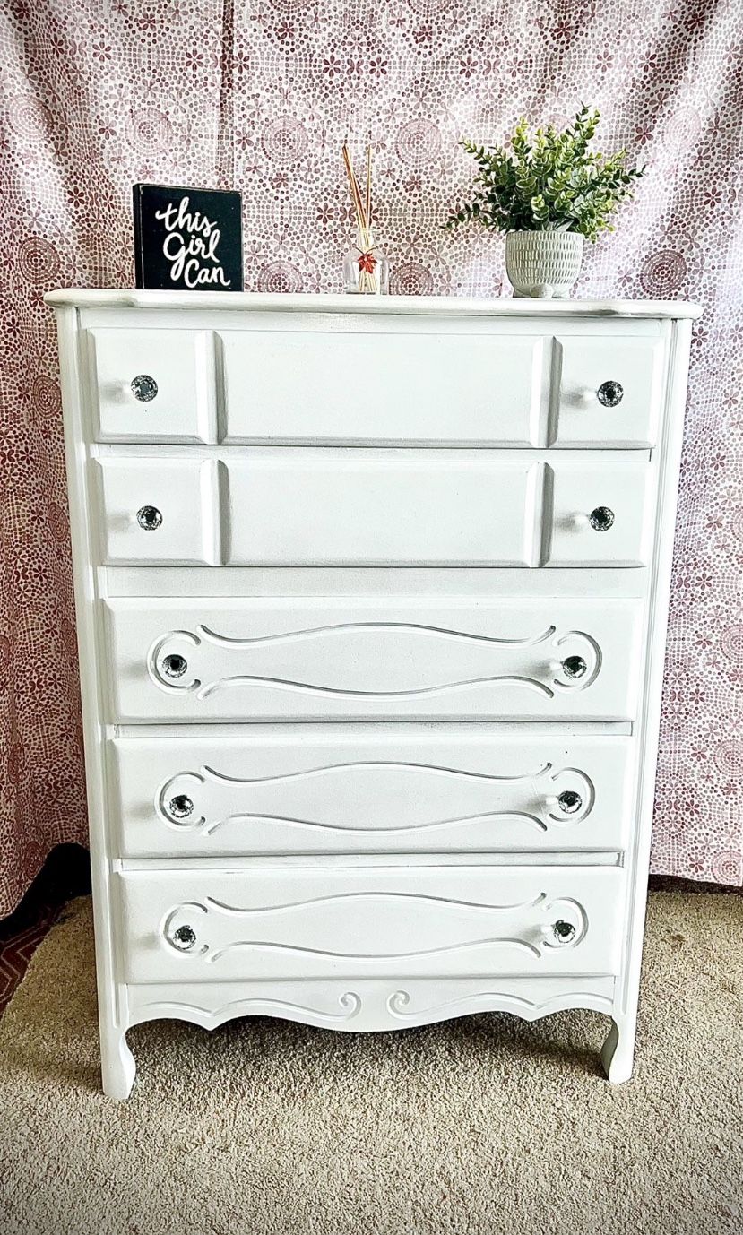 32x18x44 This is a beautiful French provincial five drawer dresser. It has just been refinished and a crisp bright white with new crystal drawer pulls. It is Solid wood , so it can be refinished over and over to last throughout the years. The drawers are all lined with removable drawer liner boards. I have several furniture listings so please take a look at the other postings if you would like. I can also do custom work and repair and refinish items you may have that need some TLC. If you are interested in purchasing any items please be able to pick up the same day or a small deposit is required to hold.
