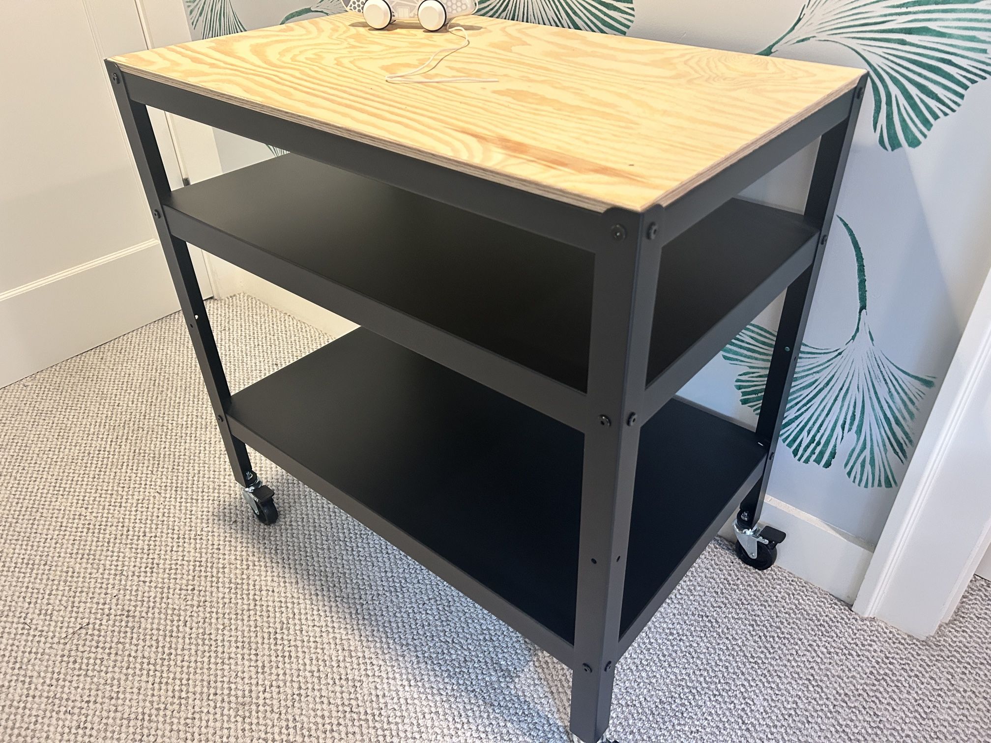 Black powered coated metal utility cart with plywood top. Great for a kitchen island, library cart, office credenza, shop cart.
