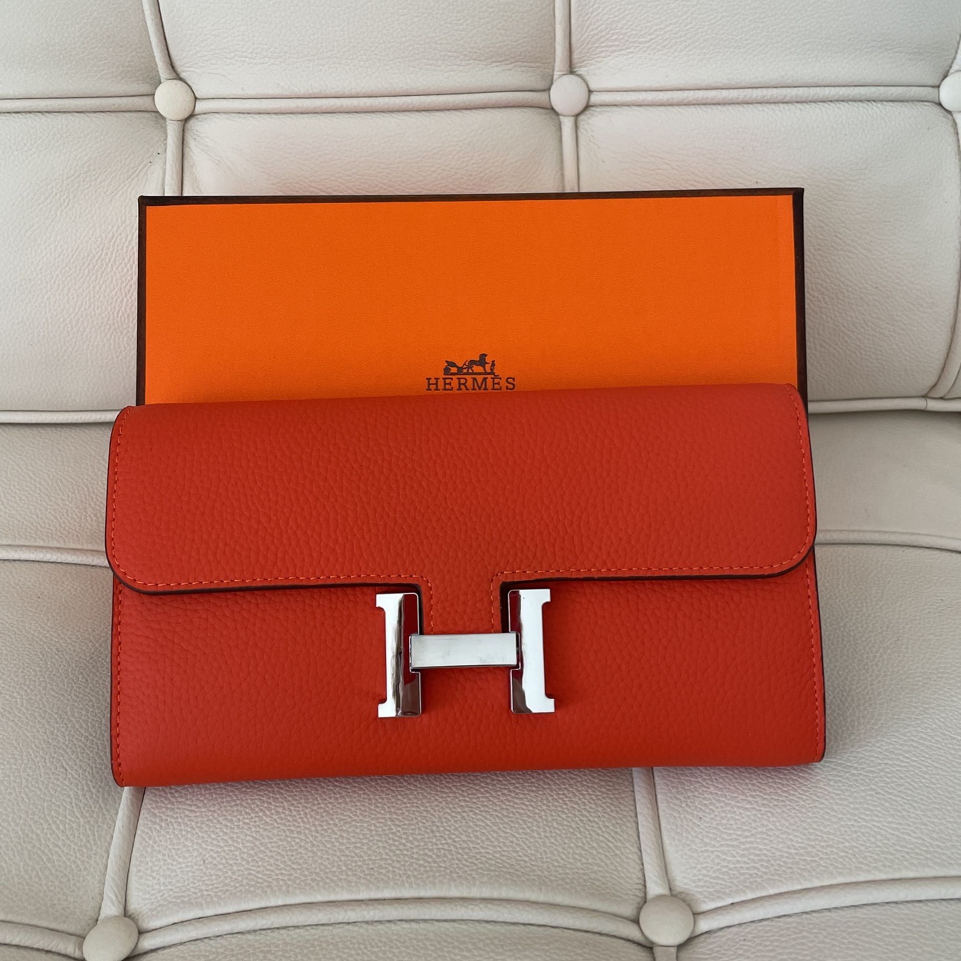 Large wallet. Beautifully crafted. 18 interior card slots. Back pocket Signature orange color. Beautiful leather. In excellent condition. No flaws. No spots. Silver hardware. Comes with box and dust bag. Same day/Next day mail out. No offers. Price is final