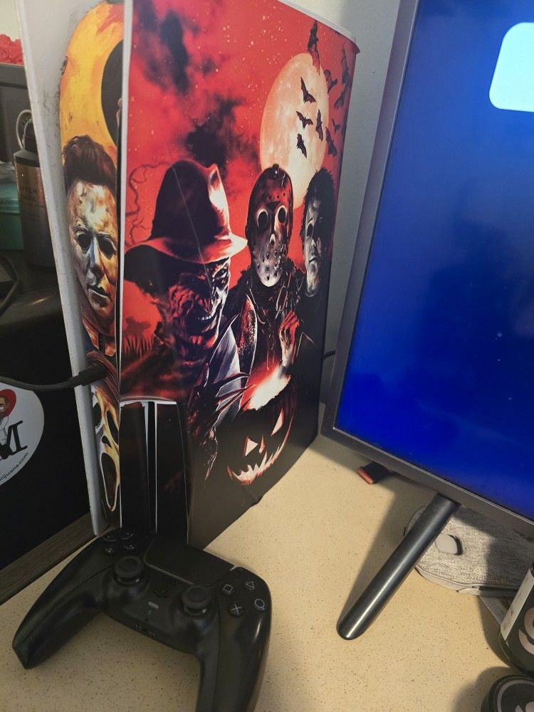 Used ps5 disc version with controller and charging cord. Halloween themed skin is removable upon request