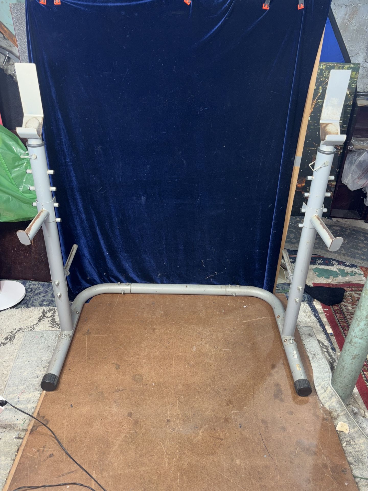 Thick and sturdy. Adjustable heights. Includes plate trees and safety clips. Can be disassembled. Olympic barbell can be purchased separately for $75.00. Pick up in Glendale Queens. Mobile pay accepted.