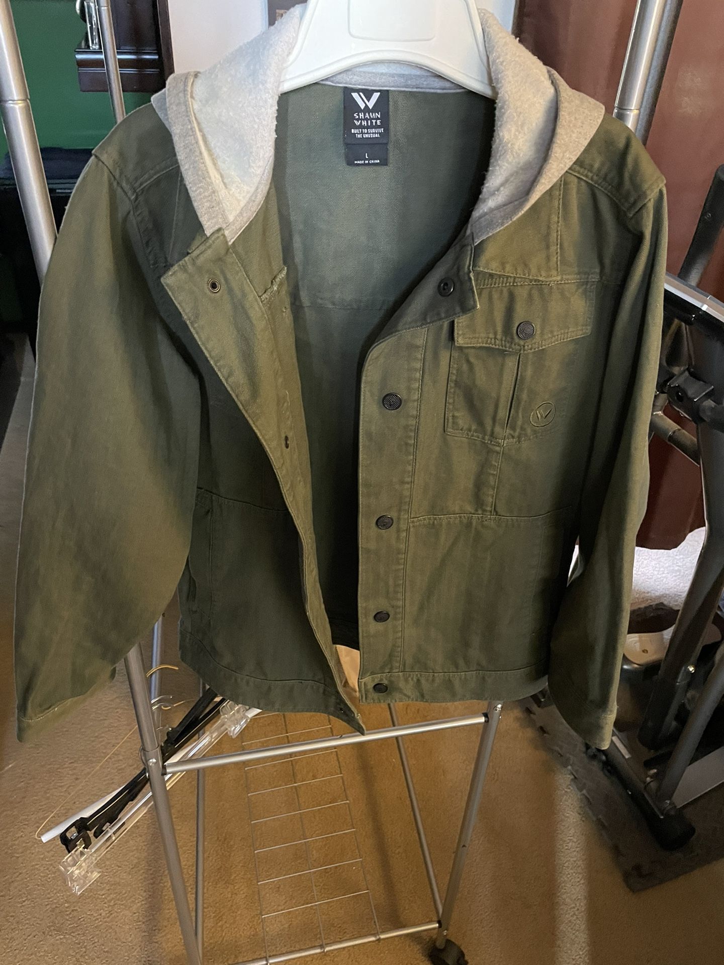 This is an boys large green denim hoodie. It is by Shaun White. It is in good condition. I am willing to meet near Vernon Hills for a cash exchange. Thank you.