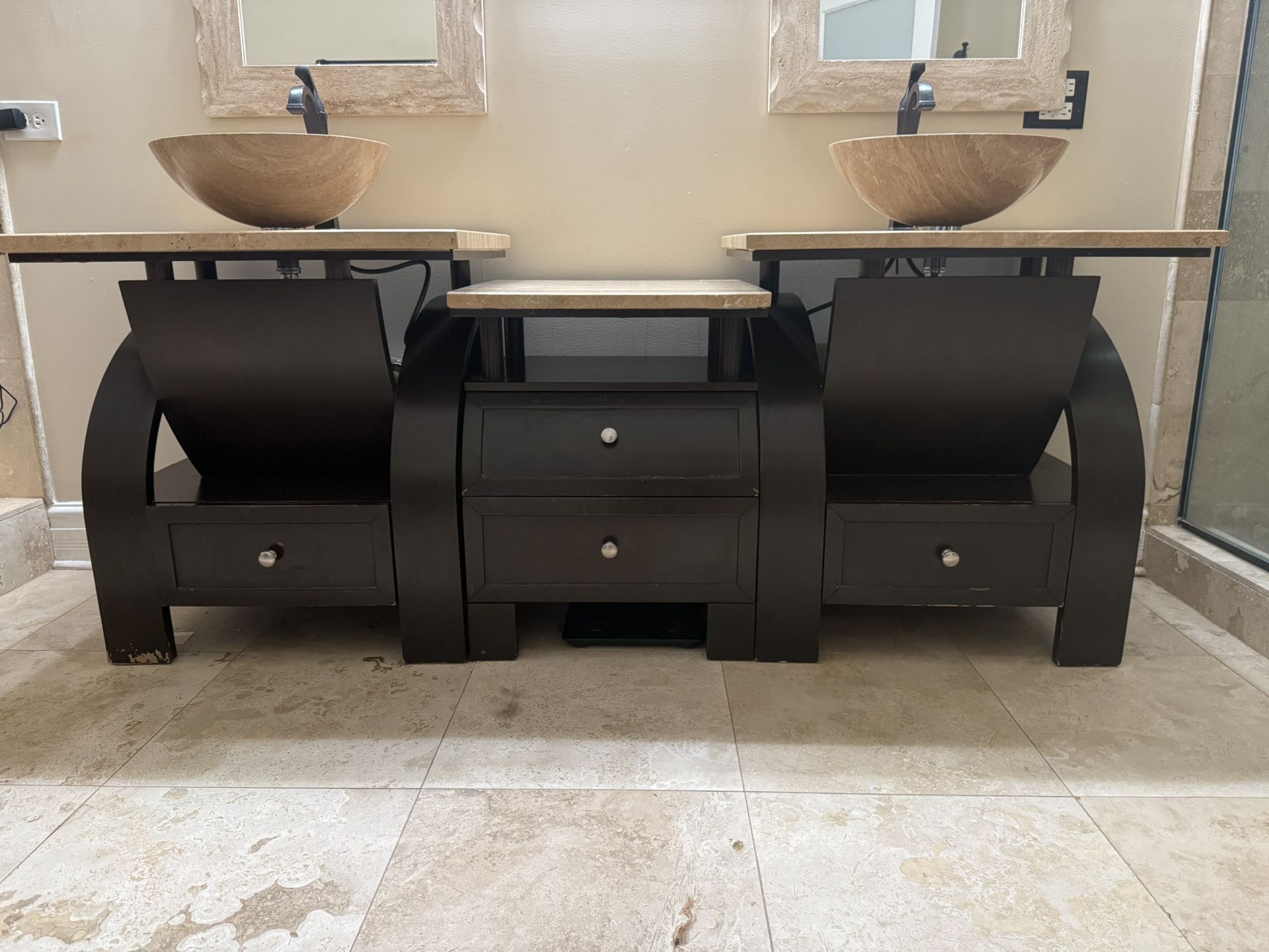 This stylish double bathroom vanity features two elegant round vessel sinks set on a solid stone countertop. The vanity has a sleek, dark wood finish with curved accents, offering a contemporary touch to any bathroom. It includes four drawers for convenient storage, adding both functionality and aesthetic appeal. The vanity is in good condition, with some minor wear and tear visible near the base. • Brand: Silkroad • Model: 77” Modern Double Sink Bathroom Vanity • Original Price: $1,960.00 • Material: Stone countertop, wooden vanity with metal drawer pulls • Dimensions: 77”w X 22”d X 30”h • Condition: Pre-owned with minor cosmetic imperfections (as shown in the photos) • Features: Two vessel sinks, four drawers for storage