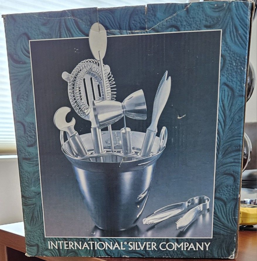 Stainless steel ice bucket with tool rack and complete set of tools. 5.25" height. Comes in original box.