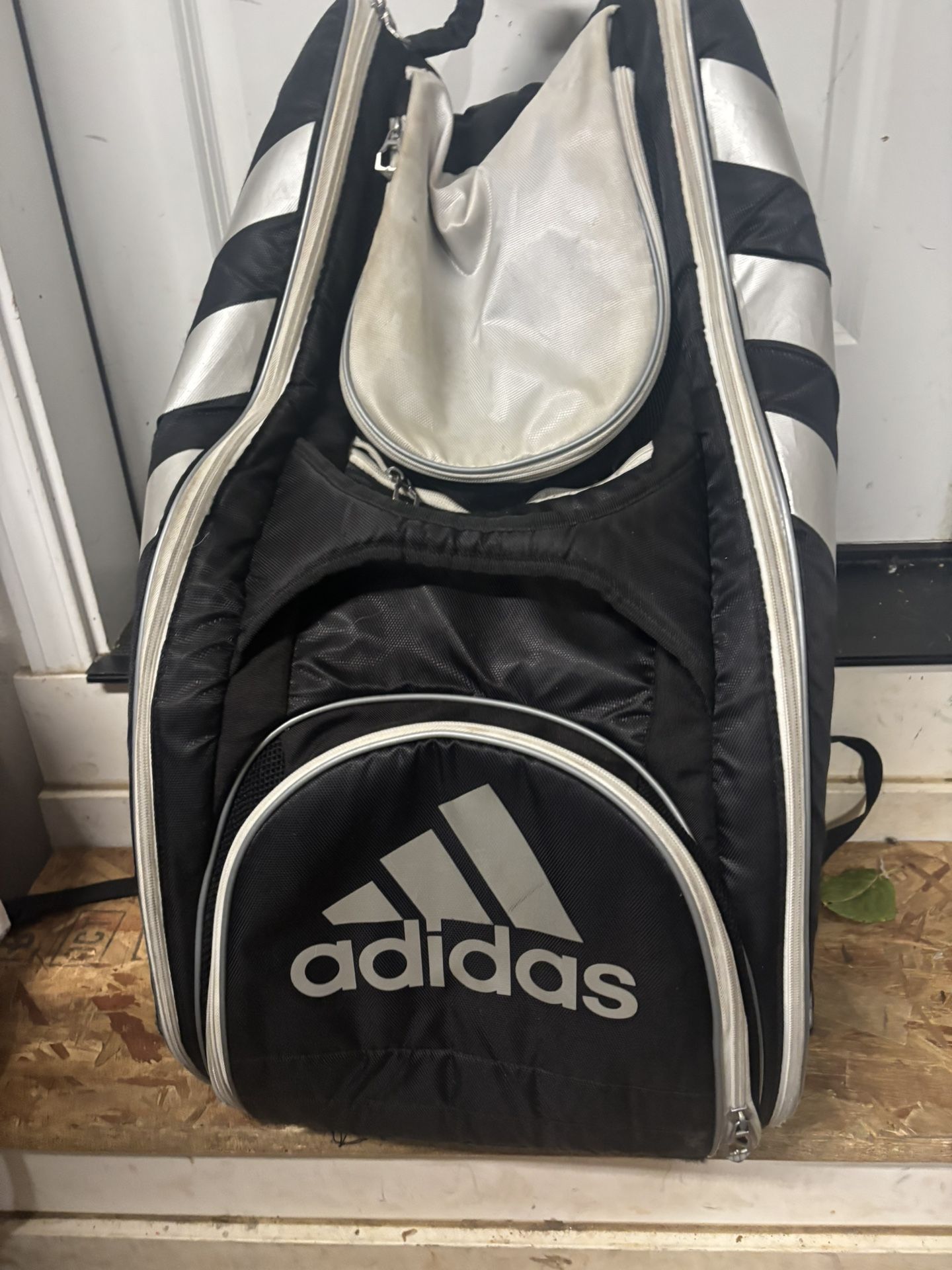 Holds about 3-4 rackets has some life in it . Huge bag holds clothes and shoes and balls and snacks spent over $150 for this . Normal ware still have a lot of life left .
