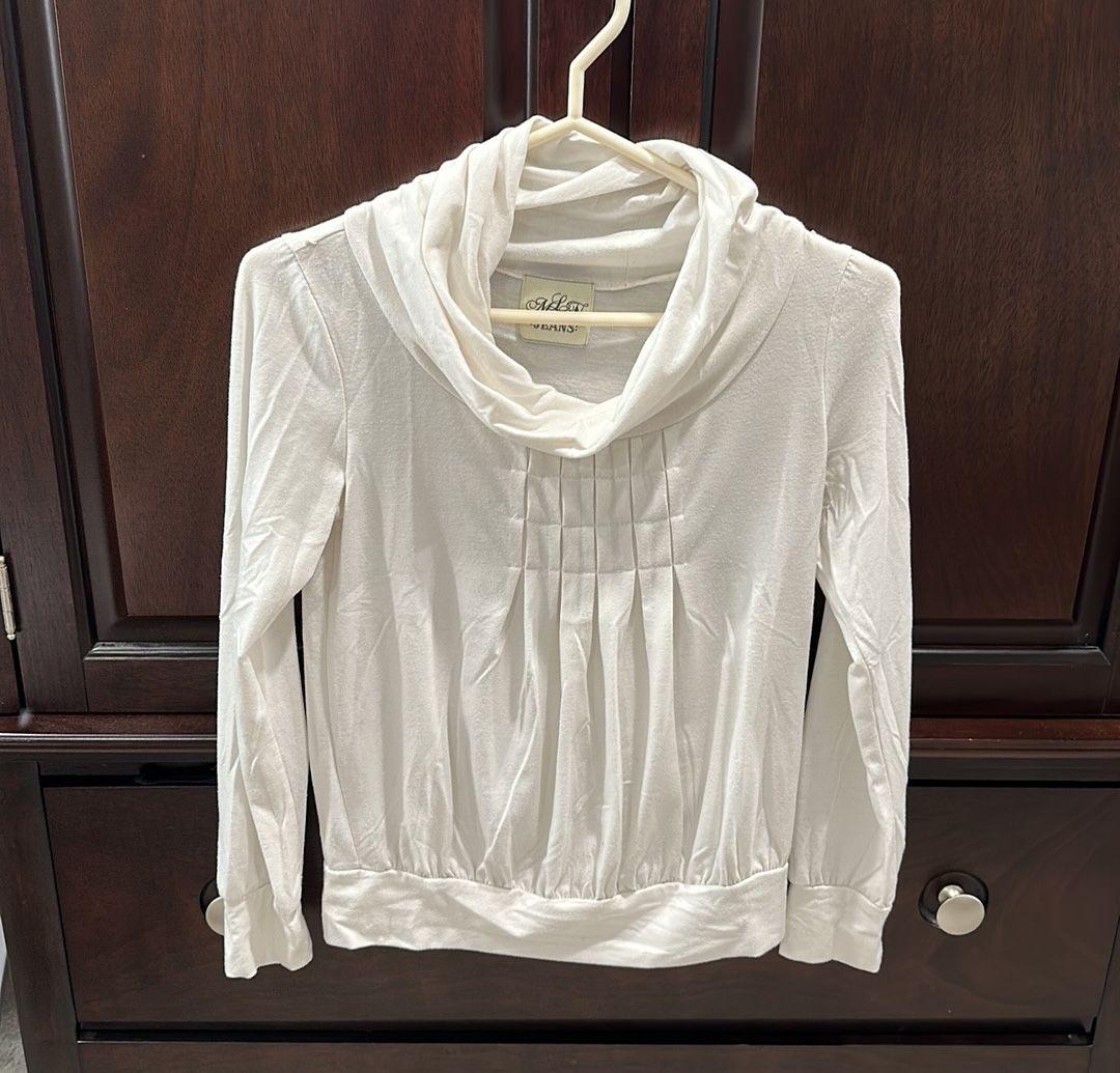 Top in cream color with a loose neck and braided print in the front. No tags but fits a small. Some pilling all around as shown in pics.