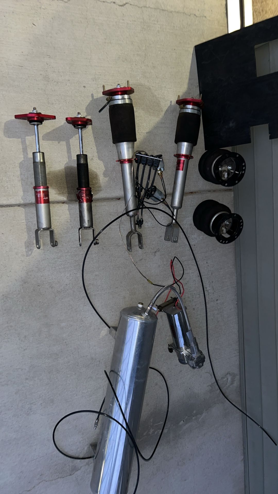 Front and rear air suspension, Air tank, Compressor, and manual management.
