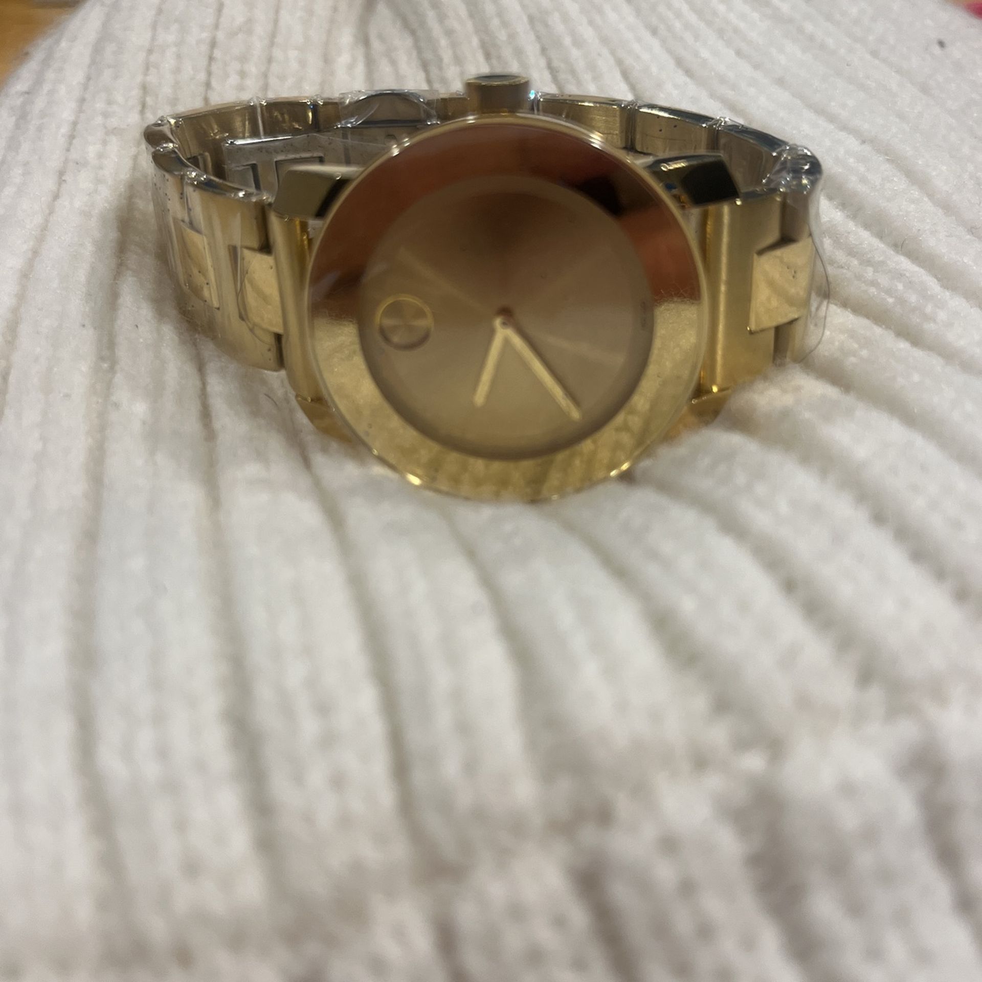 Polished Yellow Gold Tone Hands with the Movado Dot at 12 o'clock on a Champagne Dial