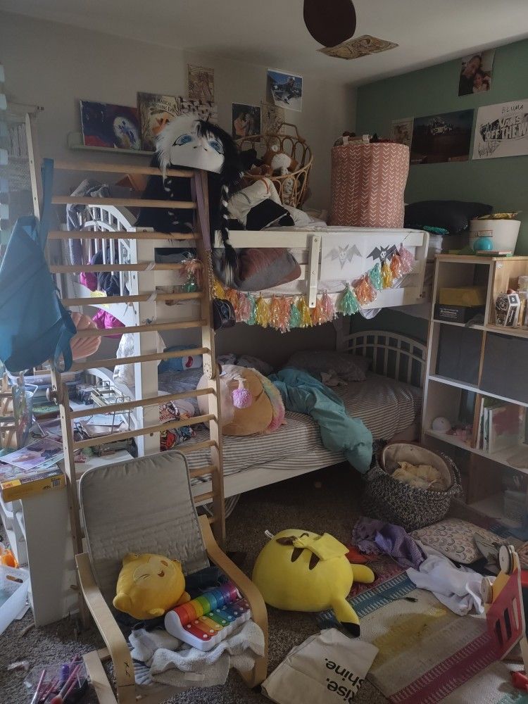 Can be stacked or used as two twin beds. Comes with ladder and both mattresses. Will throw in sheets and blankets if you would like.