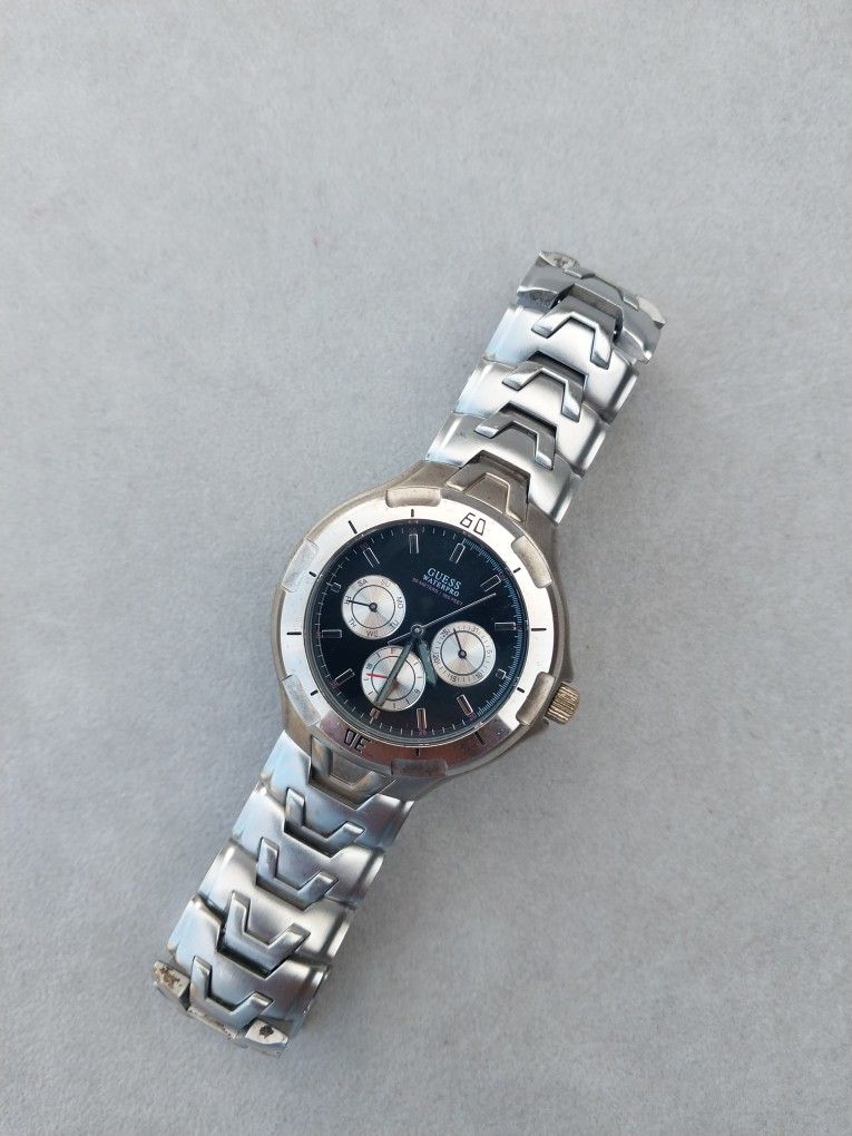 Yes, it is available! Si, sigue disponible! Please only message when you're ready to meet up. Pick up in Modesto. Men's Guess brand watch model Waterpro G85298G. See pictures for size reference and condition. I put a new battery in it, and it is ready to wear π fits a medium to small wrist. It has normal signs of wear, but overall, it's not bad. It has plenty of use left, and the price is right, especially since it has a new battery. No trades. Thank you.
