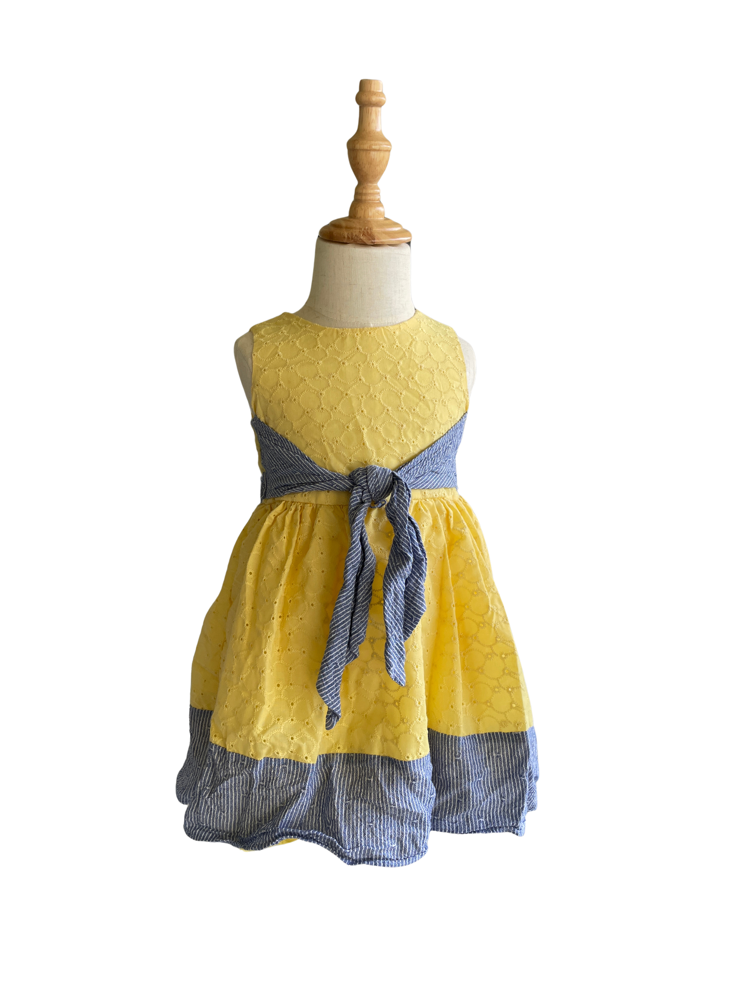 Charming yellow kids dress with a stylish blue bow and hem. Perfect for any occasion.