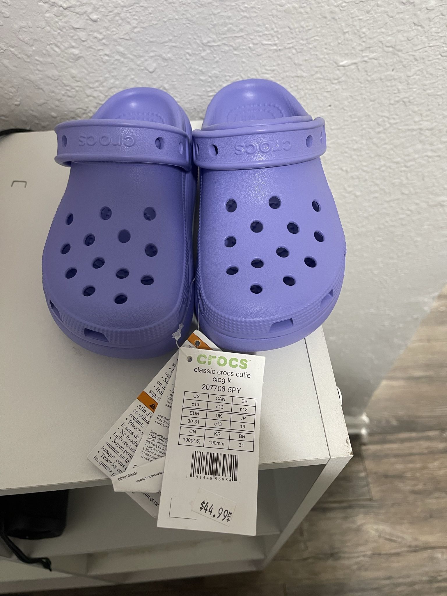 Brand new crocs. Too small for my daughter. Size C13 (kids size) 30$ tags on them