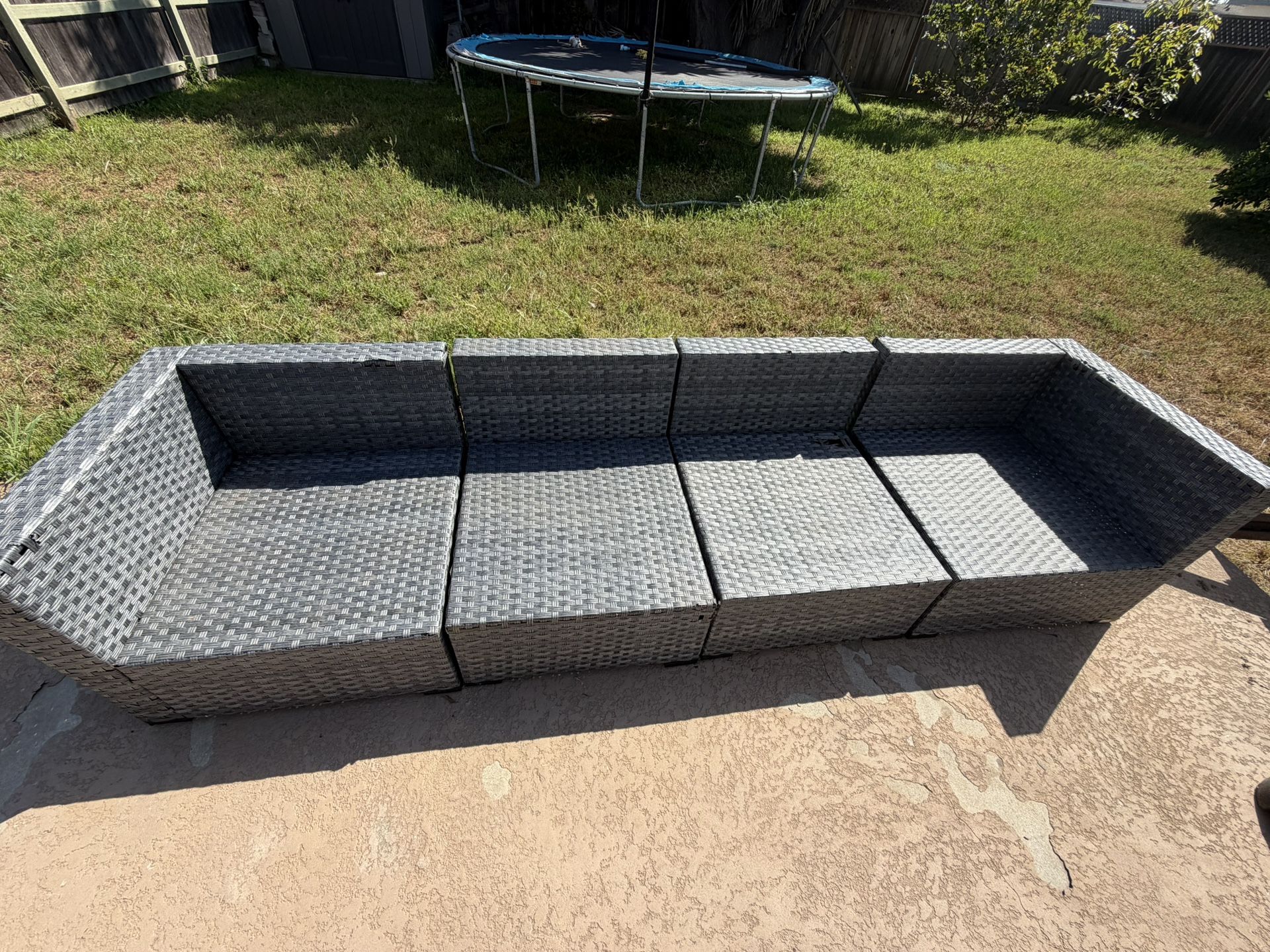 Used gray wicker outdoor sectional couch. Comes with multiple modular pieces that can be arranged in different ways. this the item has a decent amount of damage , and no cushions.