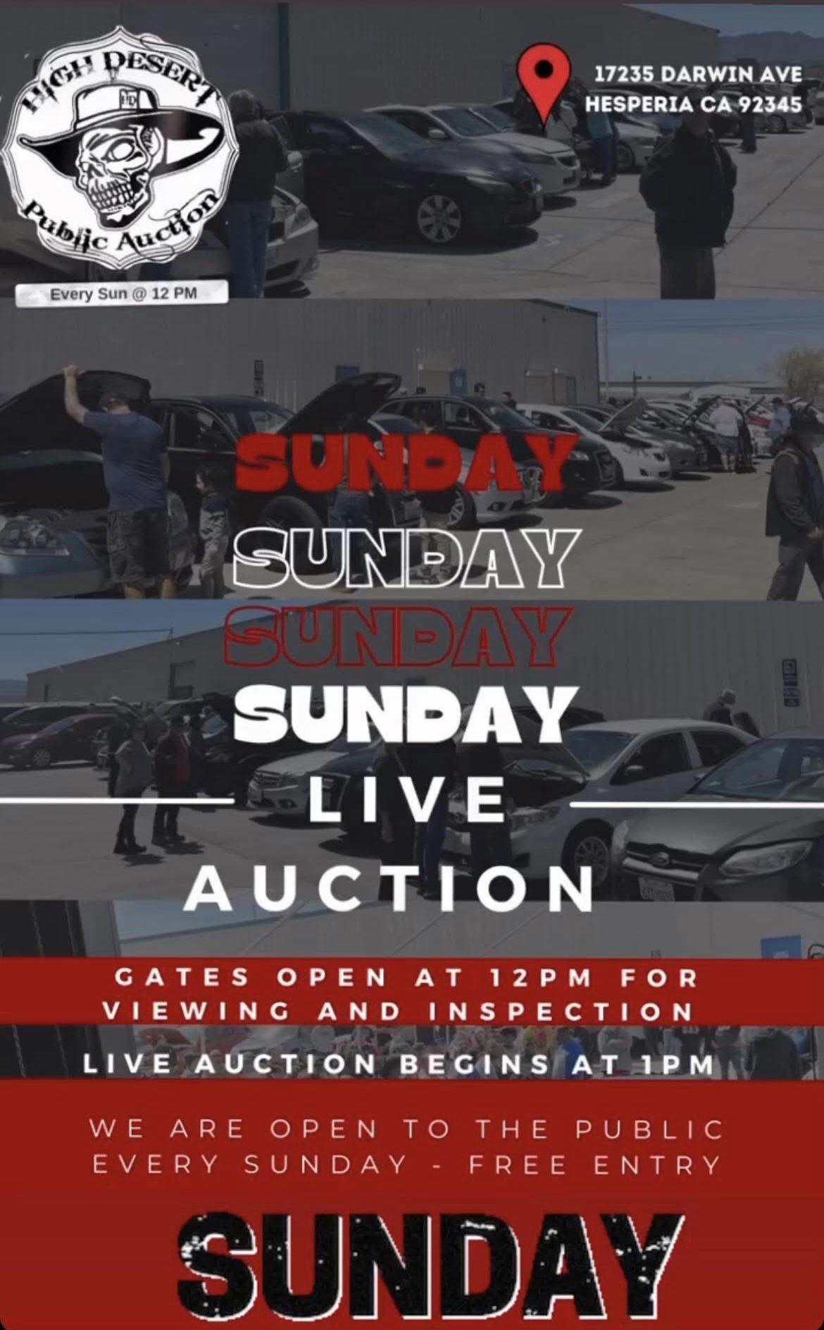 🎟WIN BIG This SUNDAY 🍀Live Auto Auction House ✔️Cars Trucks Vans & More 📌Free Entry - Sundays 📍17235 Darwin ave Hesperia 💎Public Auto Auction 💎 💸CASH / Zelle 💸 🕓 Gates open 12pm Sunday 👉🏻 Live Bidding 1pm-230pm ☎️ 760-669-9041 Vehicles sell from $2k-$6k 💫Everyone is Welcome 💫 🎯No Special license Needed As-IS AUCTION HOUSE