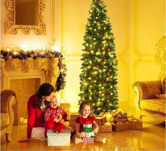 6.5Ft Pre-lit Hinged Pencil Christmas Tree w/Pine Cones Red Berries & 250 Lights NEW in a box all sales are FINAL