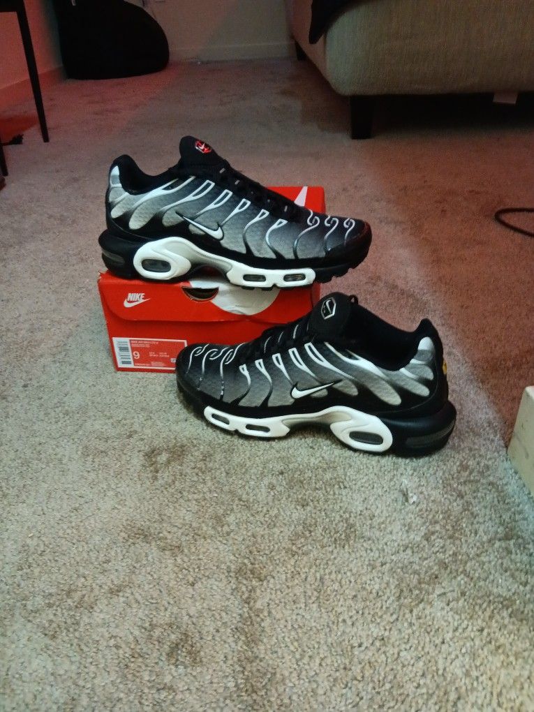 Selling a pair of Nike Air Max Plus (TN) sneakers in a sleek black, grey, and white colorway. These feature the signature wavy upper design and visible Air Max cushioning for all-day comfort and style.