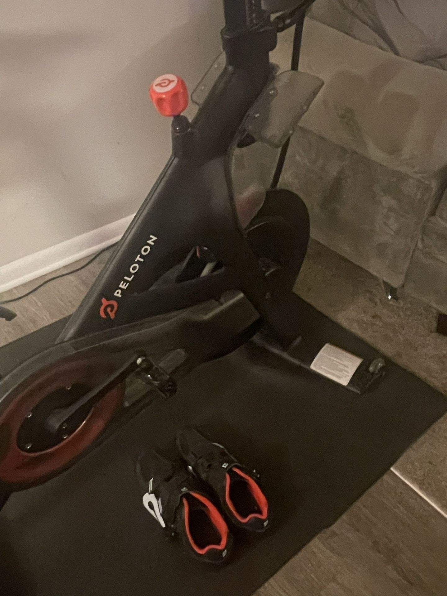Fairly new peloton bike,it great condition. Peloton mate,with 5lb weights and size 46 peloton shoes.