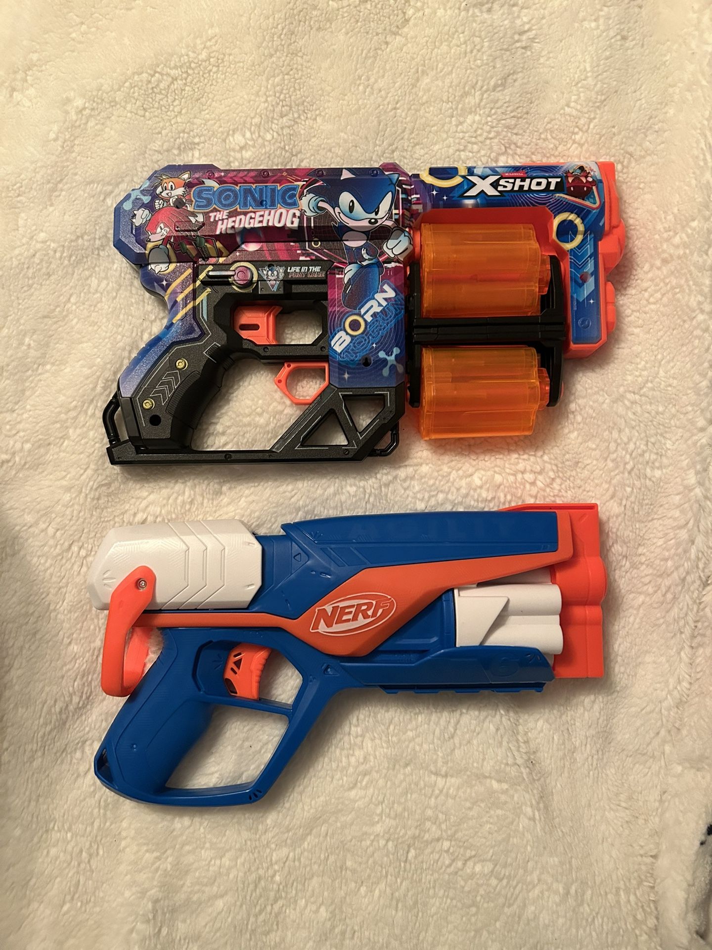 Sonic x-shot blaster gun and nerf gun. No bullets included. Each gun takes a different kind of bullet.