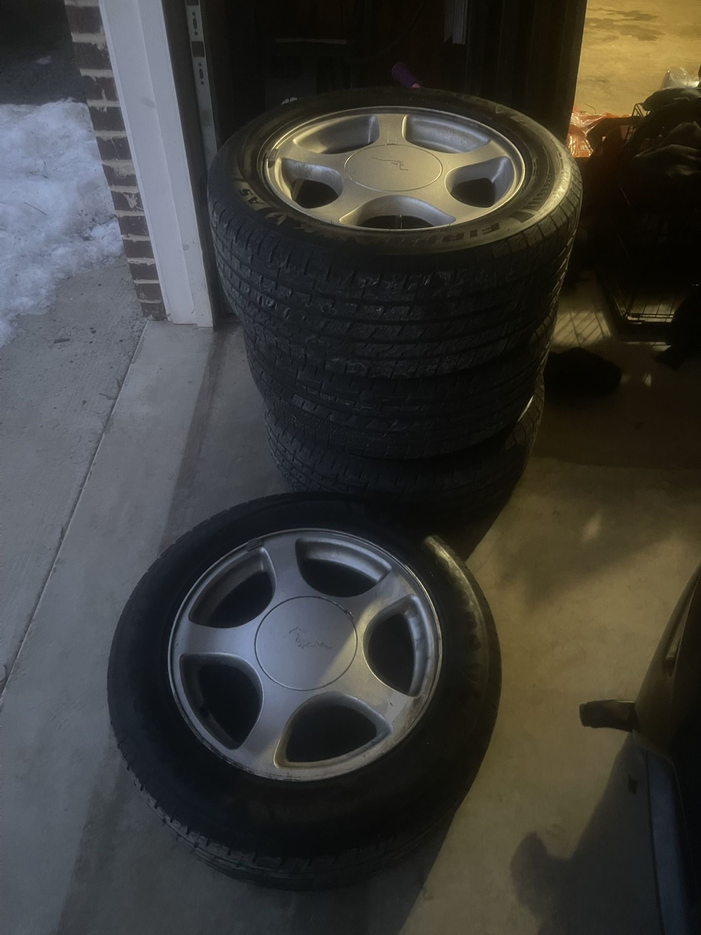 4 Mustangs rims with tires for sale. Center caps have running horse logo. Size 17. Need to sell asap. They are in good condition I jus need them gone