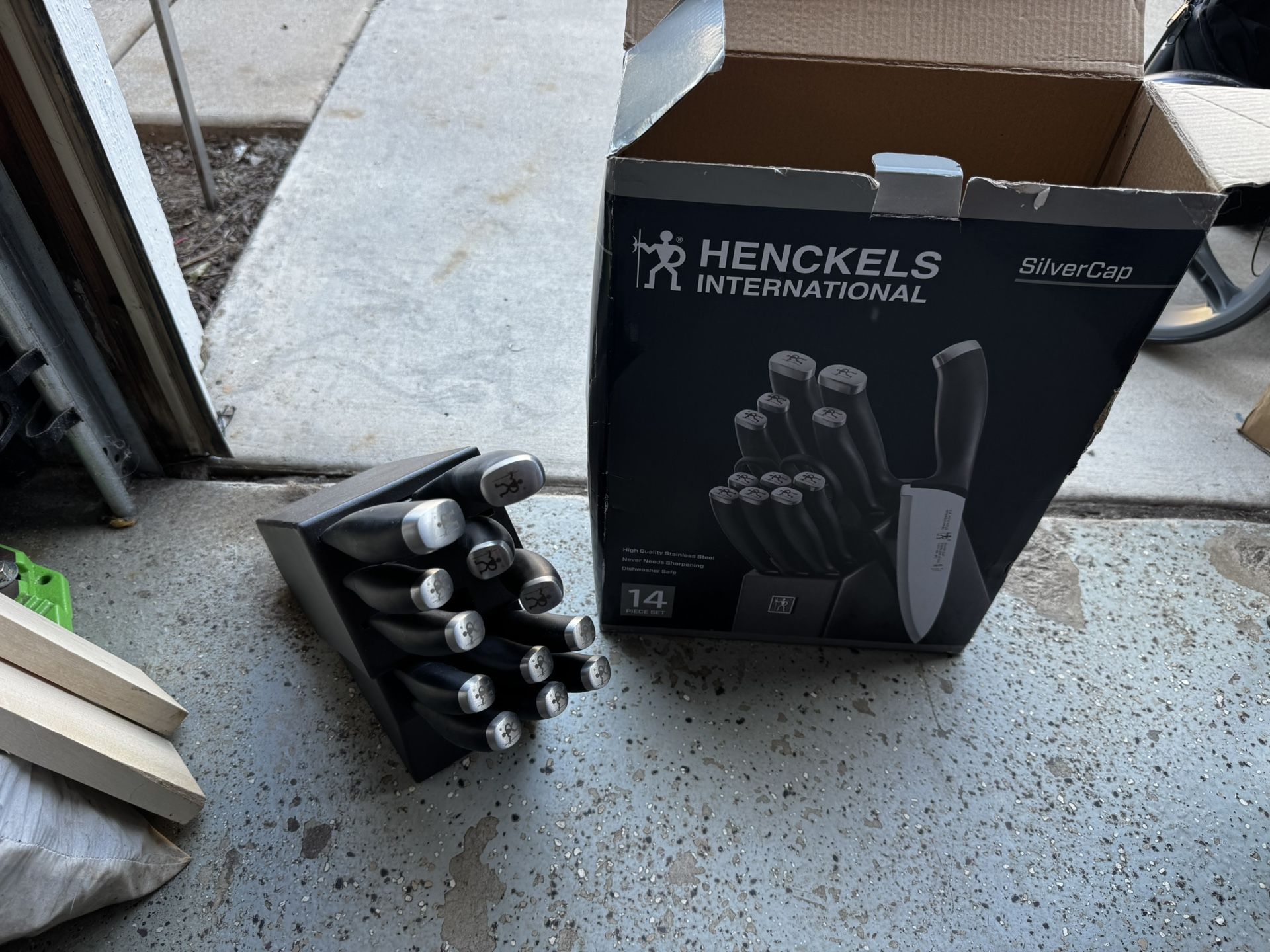 Brand new in Box - JA HENCKELS Silvercap 12-piece (Missing Scissors) knife set - The knife set includes 3- and 4-inch paring knives, 5-inch serrated utility, 5-inch hollow edge santoku, 8-inch bread knife, 8-inch chef’s knife, six -4.5-inch steak knives, and 13-slot black hardwood block - All the knives feature a micro-serrated edge that JA HENCKELS claims that the blades never need to be sharpened - Made from high-quality stainless steel and is dishwasher safe