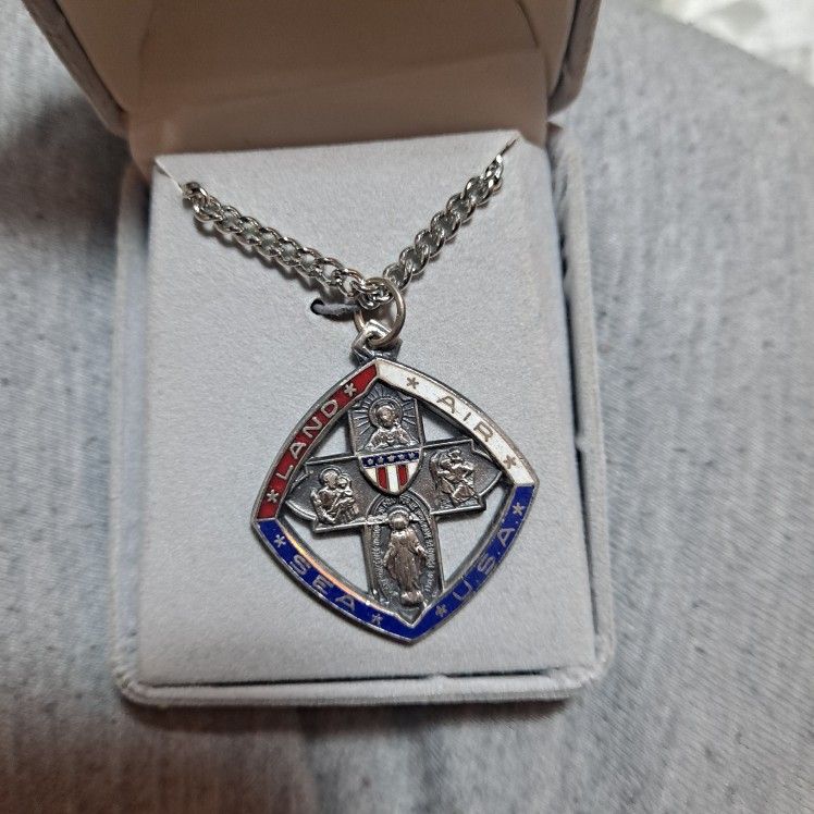 925 Sterling Silver Vintage Navy Air Land Sea Military Protection Medallion With Chain In Box. Christian Cross (WWlII STYLE REPRODUCTION)