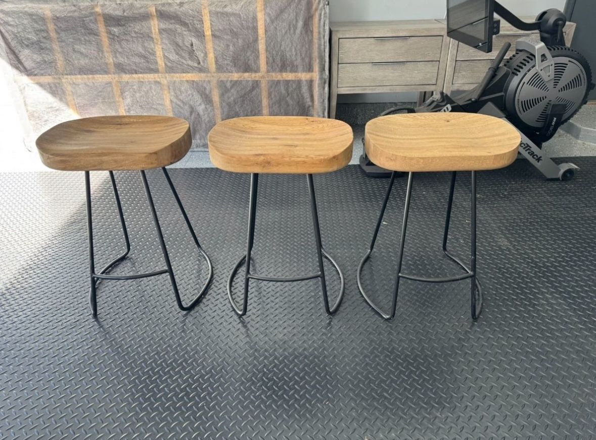 Set of 3 Restoration Hardware 1950’s Tractor Counter stools Used for about 1 year in pet and smoke free home. Over all in great condition with no major flaws Measurements: Counter Stool: 18¾"W x 16"D x 24"H Seat: 17½"W x 12½"D Seat Crown Height: 23" Footrest: 7"H Weight: 20lbs Materials: Solid oak seat with natural finish Black iron base Asking $180 for all 3 or best offer Would prefer to sell together Must be willing to pick up. No delivery