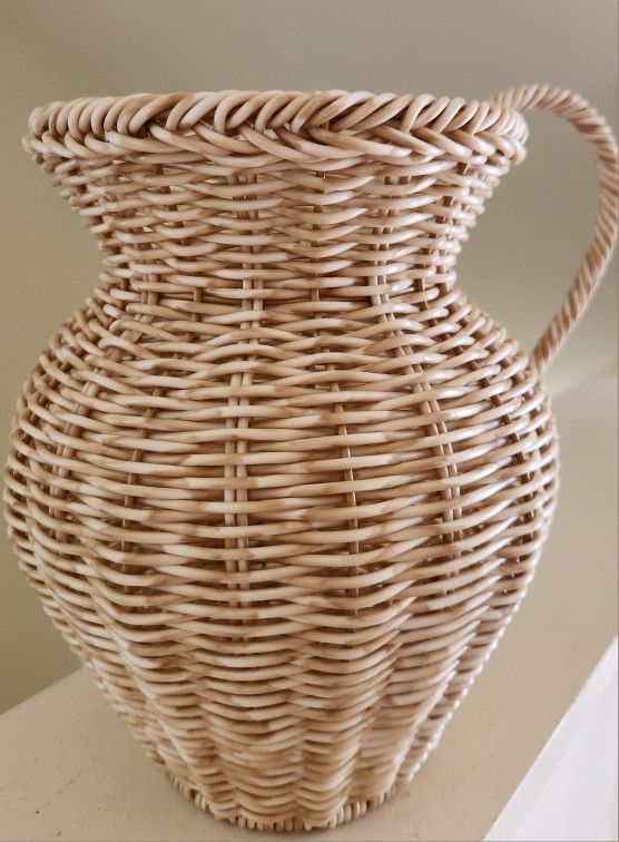 9 in high x 6 in wide Synthetic wicker floral vase Tan color and very sturdy Not made of wicker or straw