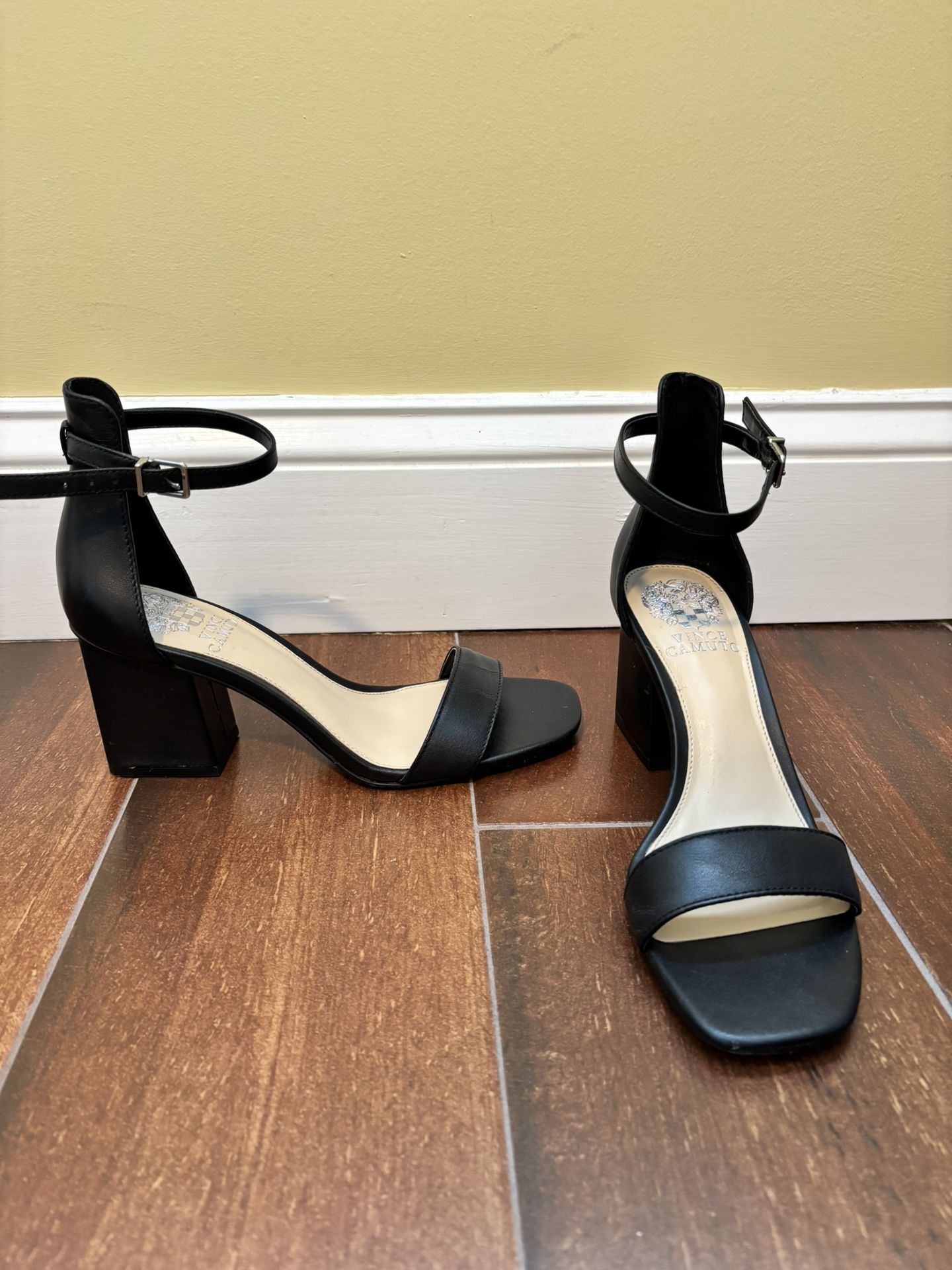 Margry Ankle Strap block heel sandal Vince camuto Size 7 Color black 2 3/4’’ heel Ankle strap with adjustable buckle closure Lightly cushioned footbed Synthetic upper, lining and sole These were used once only. I have a bad ankle, so I can’t wear heels anymore. Serious buyers only please. I’m in Oakland park by Prospect and Powerline. Pick up only. No delivery.