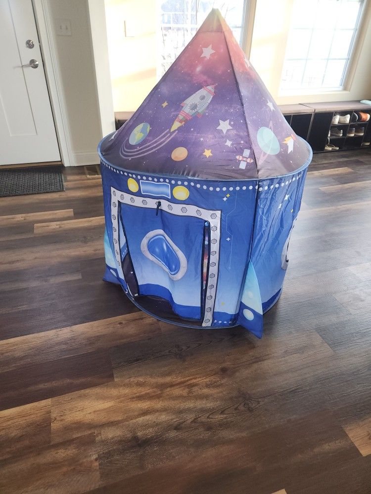 Excellent condition for a kids play tent and space themed. I will keep it up-right and can be taken apart upon pick-up for viewing.