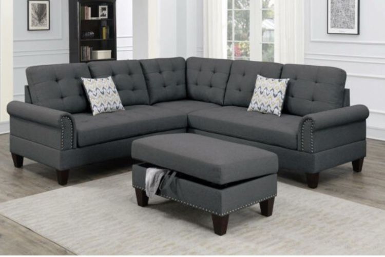 Reversible Sectional Sofa with Ottoman Item # F6474 Color: Charcoal Material: Polyfiber Dimensions: Sectional: 90″ x 90″ Ottoman: 34″ x 25″ x 19″ Available in Charcoal, Grey and Beige Some Assembly Required