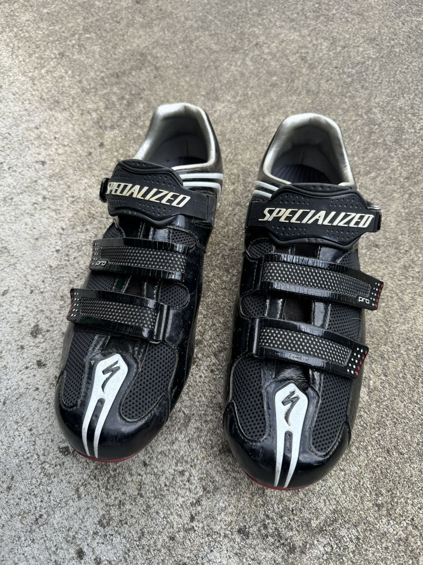 Selling used but in good condition Specialized 45 size biking shoes. Cleats need to be replaced.