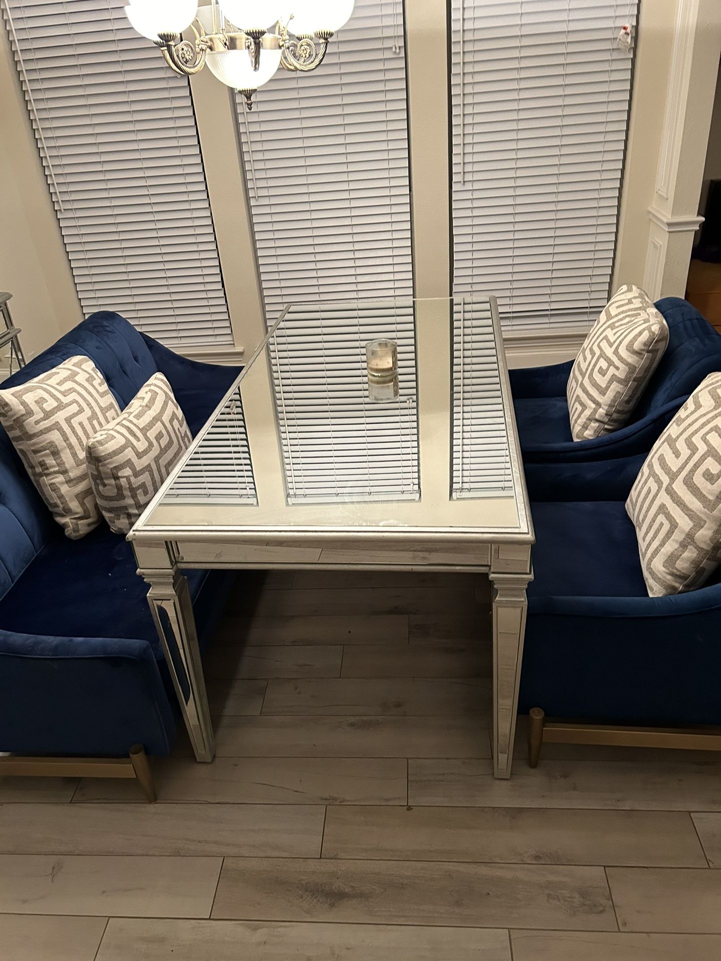 4 Piece Blue Couch - will include a white and gold coffee table and 5 matching pictures. So a total of 10 items. Negotiable