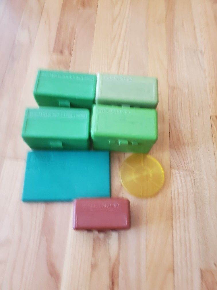 4 large x 50 cartridge boxes, 1 .38 cal. x 50 cartridge box. RCBS case lube pad and primer tray.